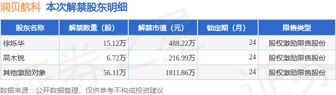 润贝航科(001316)77.95万股限售股将于9月30日解禁,占总股本0.68%