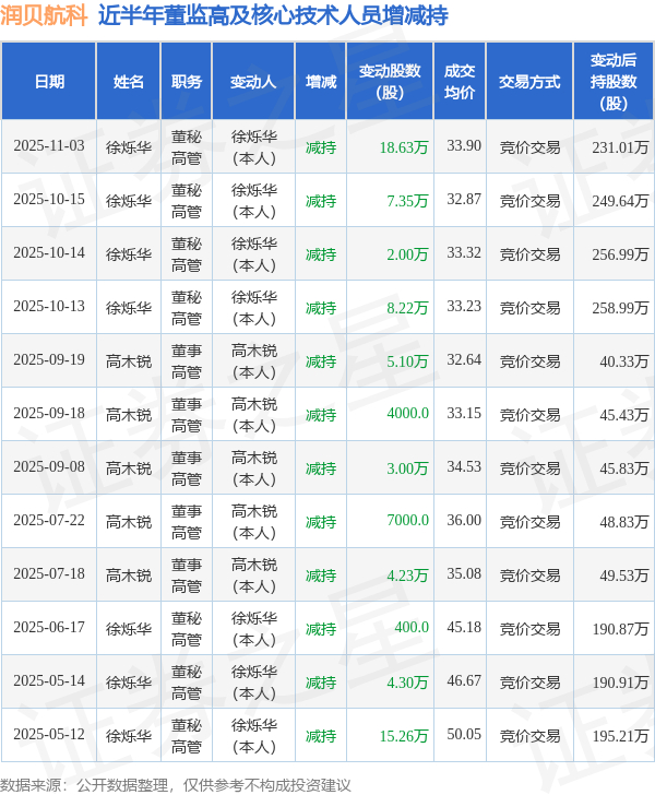 润贝航科近半年内的董监高及核心技术人员增减持详情如下: