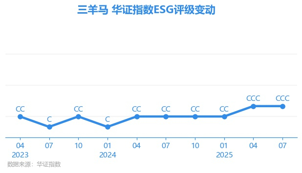 日前,华证指数公布了新一期(2025年7月31日)的ESG评级结果,三羊马(001317.SZ)获得CCC评级(华证指数评级为C起至AAA九档,C为最低档,AAA为其最高一级评级/AA为其第二档),上一期(2025年4月30日)ESG评级为CCC。本期ESG评级在22家地面运输行业A股上市公司中排名第9(上一期排名第16)。