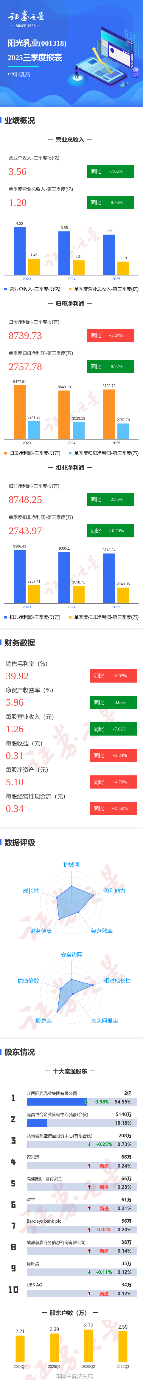 图解阳光乳业三季报:第三季度单季净利润同比下降8.78%