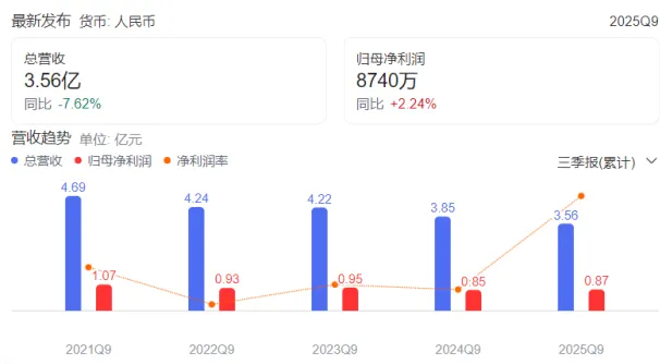 值得关注的是,阳光乳业主要股东陆续减持背后,是其业绩的徘徊不前,甚至在近年来出现净利震荡下滑的走势。有统计数据显示,上市后,阳光乳业业绩出现了较大波动,上市当年公司营收下滑9.68%,归母净利润下滑18.29%。2024年,其实现营业收入5.19亿元,同比减少8.86%,归母净利润1.15亿元,同比减少1.09%。今年前三季度,阳光乳业营收同比下滑7.62%,截至目前,阳光乳业连续七个季度营收增速下滑。