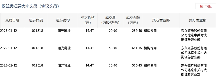 1月12日,阳光乳业大宗交易成交100万股,成交额1447万元,占当日总成交额的7.69%,成交价14.47元,较市场收盘价15.99元折价9.51%。