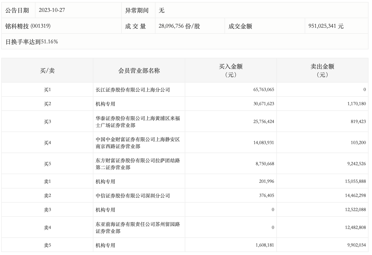 10月27日,铭科精技今日涨停,全天换手率达51.16%,振幅达6.81%。龙虎榜数据显示,营业部席位合计净买入7145.18万元。其中,机构买入3248.18万元,卖出3865.02万元,合计净卖出616.84万元。此外,长江证券上海分公司、华泰证券上海黄浦区来福士广场证券营业部分别买入6576.31万元、2575.64万元;中信证券深圳分公司、东亚前海证券苏州留园路证券营业部分别卖出1446.23万元、1248.28万元。