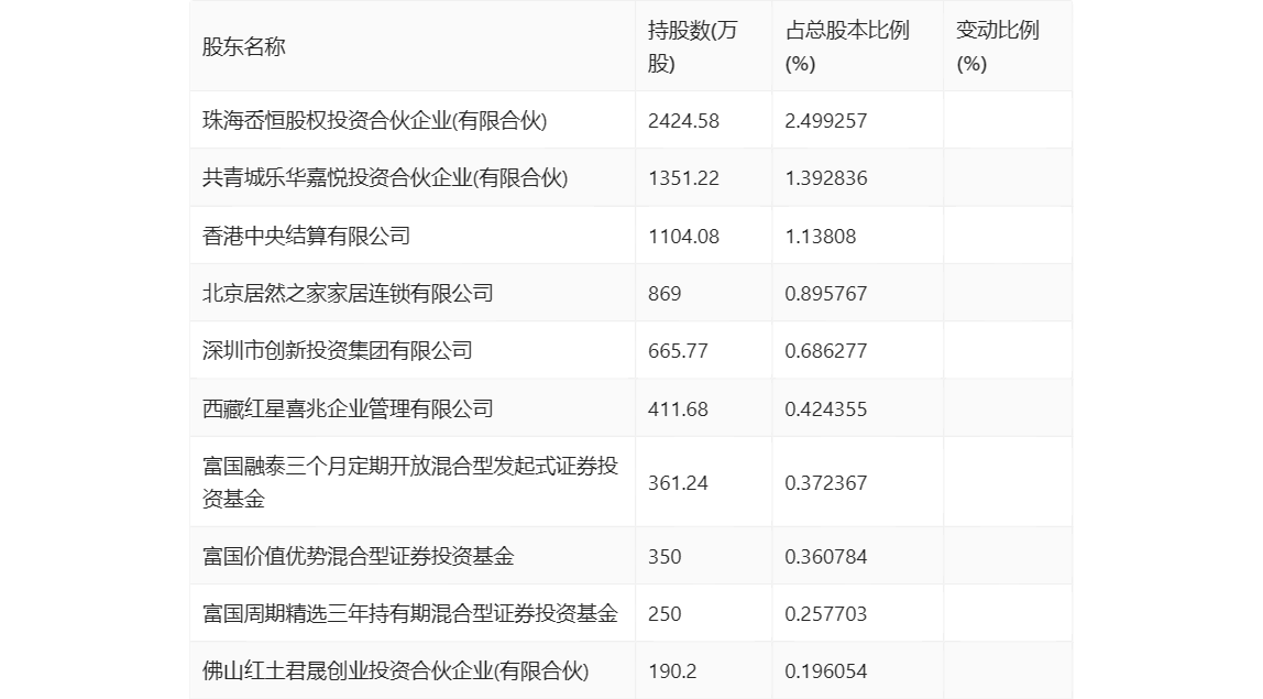 年报显示,2023年年末公司十大流通股东中,新进股东为珠海岙恒股权投资合伙企业(有限合伙)、共青城乐华嘉悦投资合伙企业(有限合伙)、北京居然之家家居连锁有限公司、深圳市创新投资集团有限公司、西藏红星喜兆企业管理有限公司、佛山红土君晟创业投资合伙企业(有限合伙),取代了三季度末的太平丰和一年定期开放债券型发起式证券投资基金、TEMASEK FULLERTON ALPHA PTE LTD、富国红利混合型证券投资基金、平安资产-工商银行-平安资产如意28号保险资产管理产品、民生加银研究精选灵活配置混合型证券投资基金、新华人寿保险股份有限公司-精选万能产品2。在具体持股比例上,香港中央结算有限公司持股有所上升。