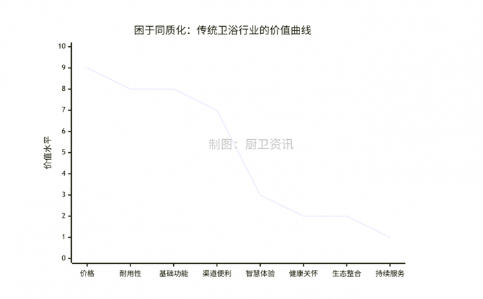 传统的卫浴制造商价值曲线,是一条随着竞争加剧而逐渐平缓下降的曲线。其价值要素高度集中在“价格”、“耐用性”、“基础功能”和“渠道便利性”上。当所有玩家都在这些维度上进行“军备竞赛”时,行业不可避免地陷入同质化与价格战的“红海”。