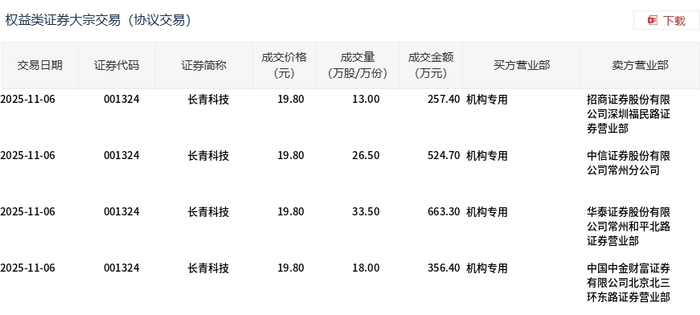 11月6日,长青科技大宗交易成交91万股,成交额1801.8万元,占当日总成交额的37.1%,成交价19.8元,较市场收盘价19.96元折价0.8%。