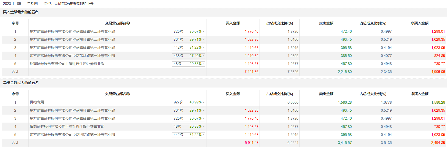 联域股份11月9日涨56.99%,全天换手率达74.65%,振幅达32.18%。龙虎榜数据显示,营业部席位合计净买入3319.78万元。其中,机构合计净卖出1586.28万元。此外,东方财富证券拉萨团结路第二证券营业部、东方财富证券拉萨东环路第二证券营业部分别买入1770.46万元、1522.80万元;东方财富证券拉萨东环路第二证券营业部、东方财富证券拉萨团结路第二证券营业部分别卖出493.45万元、472.46万元。