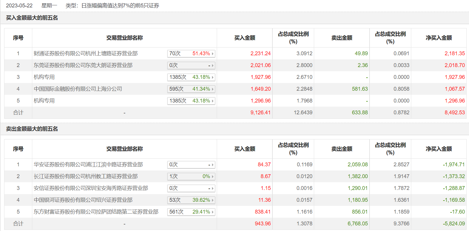 具体来看,机构合计净买入3224.91万元。此外,知名游资现身龙虎榜,赵老哥(中国银河证券股份有限公司绍兴证券营业部)净卖出1169.58万元。此外,财通证券杭州上塘路证券营业部、东莞证券东莞大朗证券营业部分别买入2231.24万元、2021.06万元;华安证券浦江江滨中路证券营业部、长江证券杭州教工路证券营业部分别卖出2059.08万元、1382.00万元。