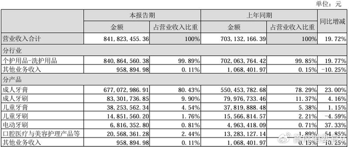 上半年,成人基础口腔护理产品营收为7.60亿元,占总营收的90.33%;儿童基础口腔护理产品营收为5310.51万元,占总营收的6.30%,电动口腔护理产品营收为681.64万元,占总营收的0.81%;口腔医疗与美容护理产品营收为2056.84万元,占总营收的2.44%。