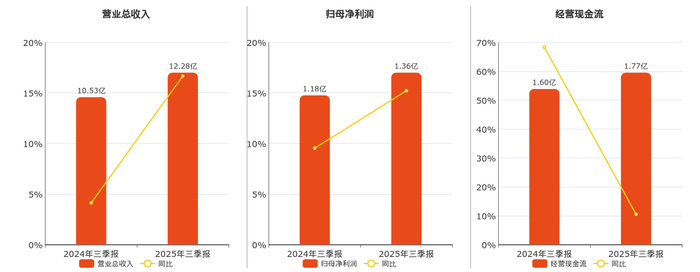 公司营业总收入为12.28亿元,较去年同报告期营业总收入增加1.75亿元,实现3年连续上涨,同比较去年同期上涨16.66%。归母净利润为1.36亿元,较去年同报告期归母净利润增加1794.27万元,实现3年连续上涨,同比较去年同期上涨15.21%。经营活动现金净流入为1.77亿元,较去年同报告期经营活动现金净流入增加1677.39万元,实现3年连续上涨,同比较去年同期上涨10.48%。