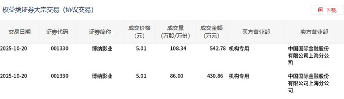 10月20日,博纳影业大宗交易成交194.34万股,成交额973.64万元,占当日总成交额的2.72%,成交价5.01元,较市场收盘价6.13元折价18.27%。