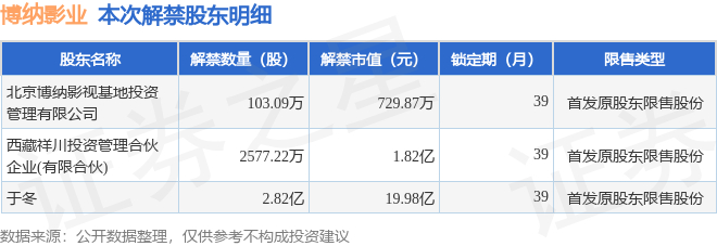 证券之星消息,根据市场公开信息整理,博纳影业(001330)于11月18日将有3.09亿股限售股份解禁,为公司首发原股东限售股份,占公司总股本22.48%。(本次数据根据历史公告整理得出,实际情况以上市公司最新公告为准)最近一年内,该股累计解禁1030.89万股,占总股本的0.75%。本次解禁后,公司已无限售股份。具体如下图所示: