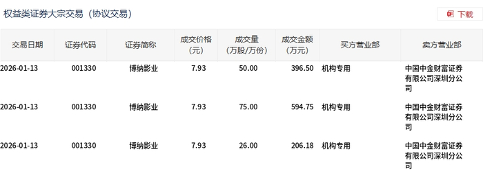 1月13日,博纳影业大宗交易成交151万股,成交额1197.43万元,占当日总成交额的0.67%,成交价7.93元,较市场收盘价9.11元折价12.95%。
