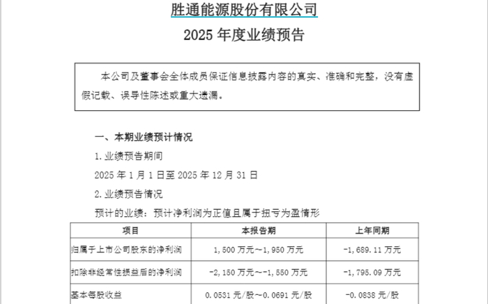 1月30日晚,胜通能源(001331.SZ)发布2025年度业绩预告称,预计2025年度归母净利润为1500万元至1950万元,上年同期为-1689.11万元;预计扣非净利润为-2150万元至-1550万元,上年同期为-1795.09万元。