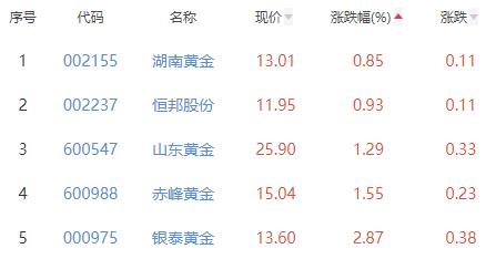 湖南黄金、恒邦股份、山东黄金、赤峰黄金、银泰黄金位列涨幅榜后五位,涨幅分别为0.85%、0.93%、1.29%、1.55%、2.87%。