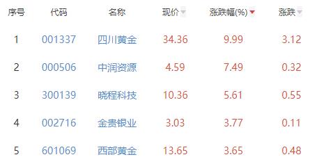 其中,四川黄金、中润资源、晓程科技、金贵银业、西部黄金位列板块涨幅前五位,涨幅分别为9.99%、7.49%、5.61%、3.77%、3.65%。