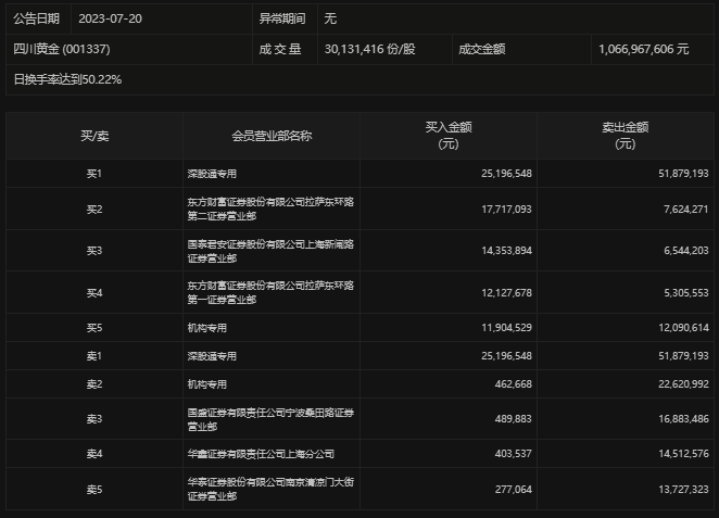 7月20日,四川黄金今日涨4.63%,龙虎榜数据显示,上榜营业部席位全天成交2.34亿元,占当日总成交金额比例为21.94%。其中,买入金额为8293.29万元,卖出金额为1.51亿元,合计净卖出6825.53万元。