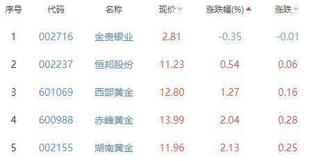 金贵银业、恒邦股份、西部黄金、赤峰黄金、湖南黄金位列涨幅榜后五位,涨幅分别为-0.35%、0.54%、1.27%、2.04%、2.13%。