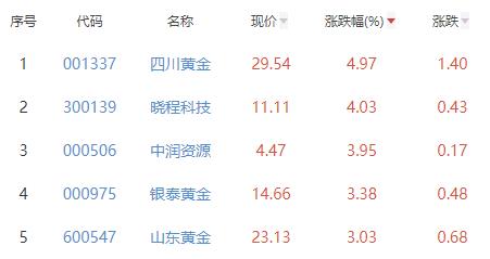 其中,四川黄金、晓程科技、中润资源、银泰黄金、山东黄金位列板块涨幅前五位,涨幅分别为4.97%、4.03%、3.95%、3.38%、3.03%。