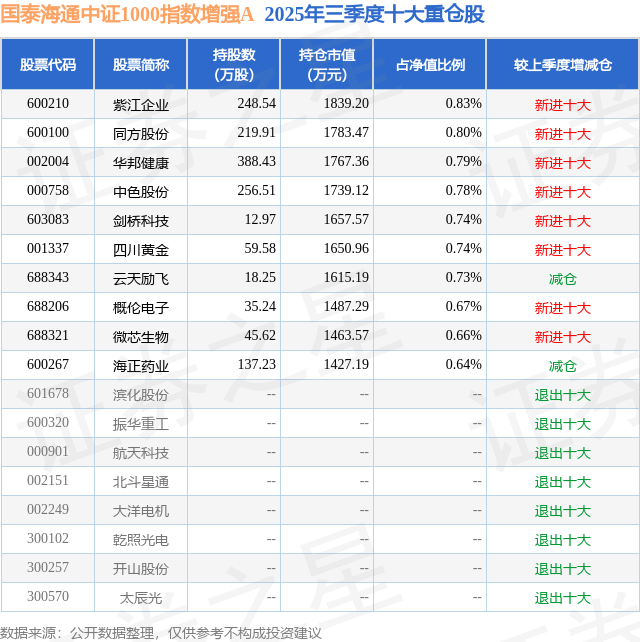 国泰海通中证1000指数增强A的前十大重仓股如下: