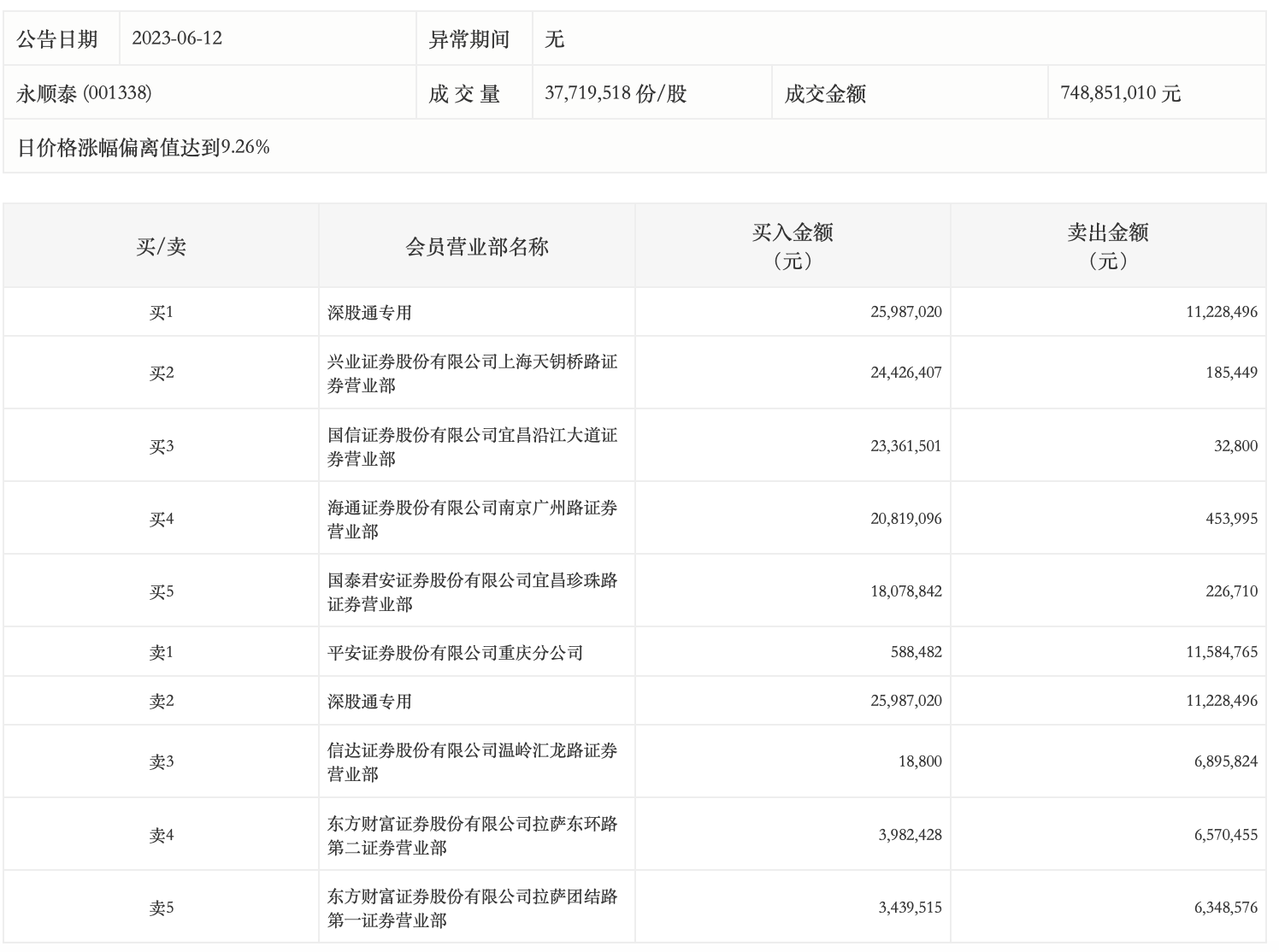 6月12日,永顺泰今日涨停,龙虎榜数据显示,上榜营业部席位全天成交1.64亿元,占当日总成交金额比例为21.93%。其中,买入金额为1.21亿元,卖出金额为4352.71万元,合计净买入7717.5万元。