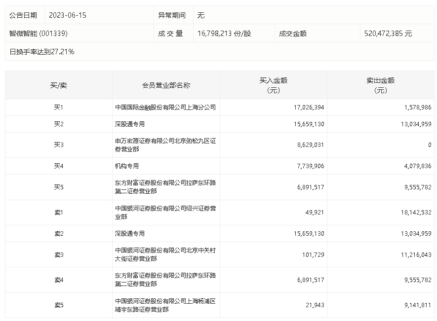 6月15日,智微智能今日跌2.08%,龙虎榜数据显示,上榜营业部席位全天成交1.23亿元,占当日总成交金额比例为23.61%。其中,买入金额为5611.96万元,卖出金额为6674.99万元,合计净卖出1063.04万元。