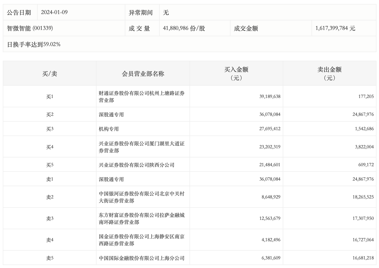 1月9日,智微智能今日涨停,龙虎榜数据显示,上榜营业部席位全天成交2.79亿元,占当日总成交金额比例为17.28%。其中,买入金额为1.79亿元,卖出金额为1.0亿元,合计净买入7942.6万元。