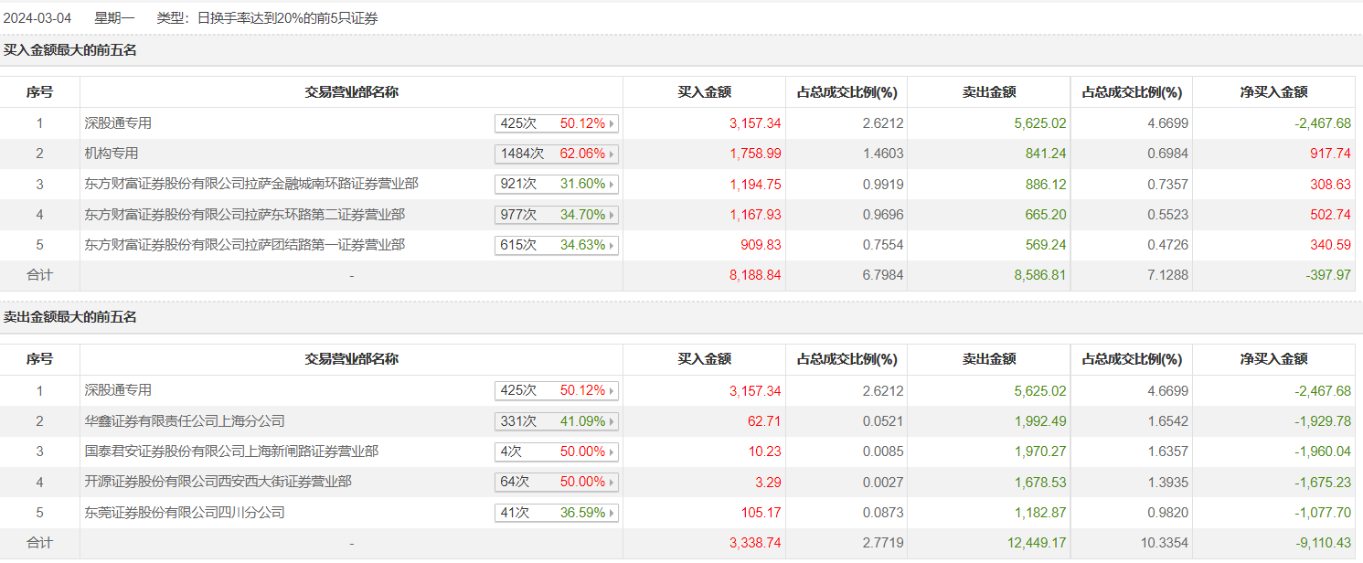 具体来看,机构买入1758.99万元,卖出841.24万元,合计净买入917.74万元。此外,深股通专用、东方财富证券拉萨金融城南环路证券营业部分别买入3157.34万元、1194.75万元;深股通专用、华鑫证券上海分公司分别卖出5625.02万元、1992.49万元。