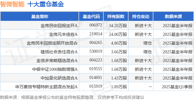 根据2025基金半年报公募基金重仓股数据,重仓该股的公募基金共7家,其中持有数量最多的公募基金为金鹰基金的金鹰民安回报定开A。金鹰民安回报定开A目前规模为9.46亿元,最新净值1.0843(9月25日),较上一交易日上涨0.97%,近一年上涨33.3%。该公募基金现任基金经理为林龙军。林龙军在任的基金产品包括:金鹰鑫益混合A,管理时间为2018年5月17日至今,期间收益率为37.14%;金鹰持久增利债券(LOF)C,管理时间为2018年5月17日至今,期间收益率为52.47%;金鹰元丰债券A,管理时间为2018年5月17日至今,期间收益率为75.64%;金鹰元祺债券A,管理时间为2018年6月2日至今,期间收益率为55.08%。