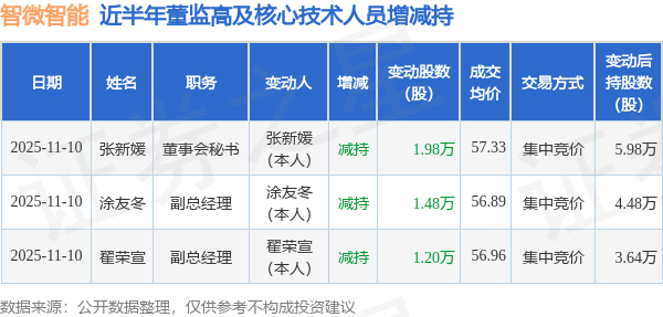 智微智能近半年内的董监高及核心技术人员增减持详情如下: