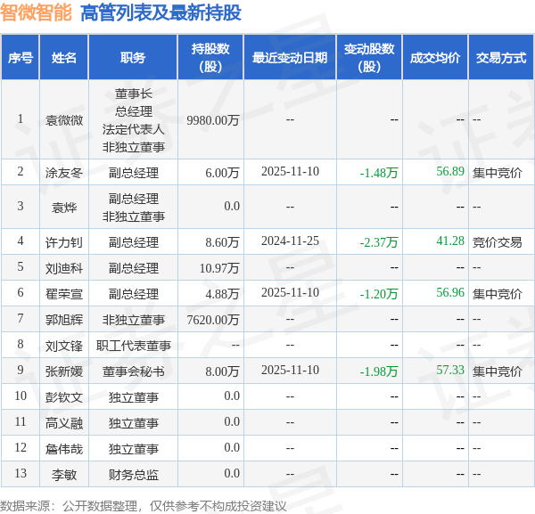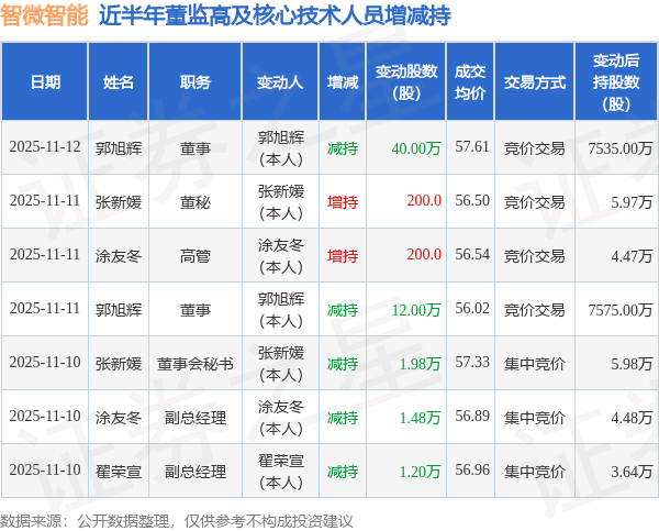 智微智能近半年内的董监高及核心技术人员增减持详情如下: