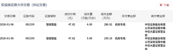 1月6日,智微智能大宗交易成交11万股,成交额526.02万元,占当日总成交额的1.06%,成交价47.82元,较市场收盘价54.08元折价11.58%。