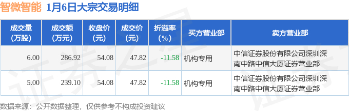 1月6日智微智能现2笔折价11.58%的大宗交易 合计成交526.02万元