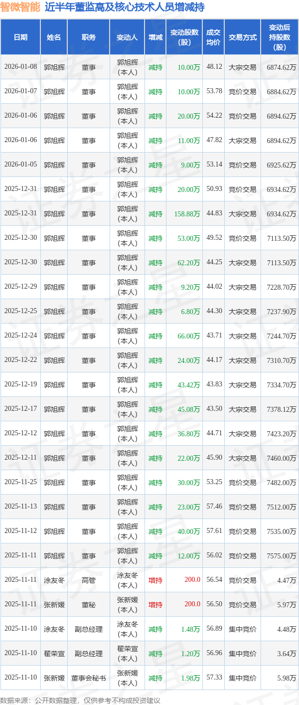 智微智能近半年内的董监高及核心技术人员增减持详情如下: