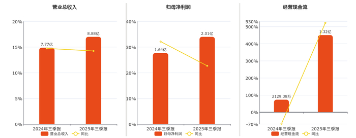 公司营业总收入为8.88亿元。归母净利润为2.01亿元。经营活动现金净流入为1.32亿元。