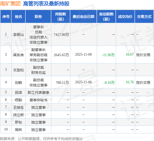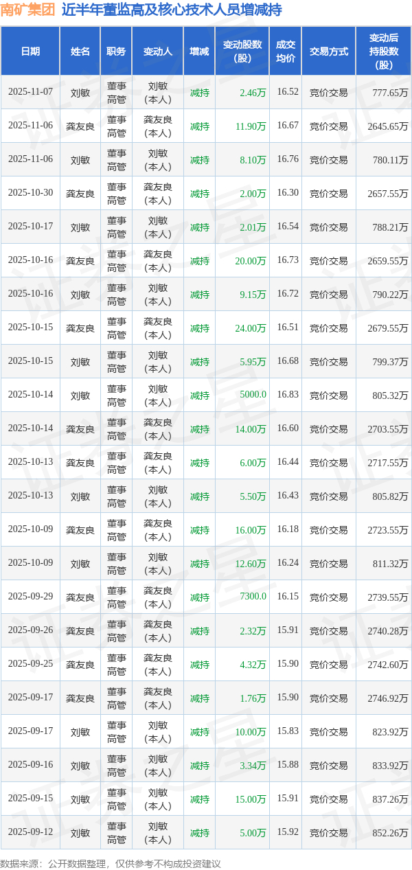 证券之星消息,根据11月10日市场公开信息、上市公司公告及交易所披露数据整理,南矿集团(001360)最新董监高及相关人员股份变动情况:2025年11月7日公司董事,高管刘敏共减持公司股份2.46万股,占公司总股本为0.0121%。变动期间公司股价上涨0.3%,11月7日当日收盘报16.5元。