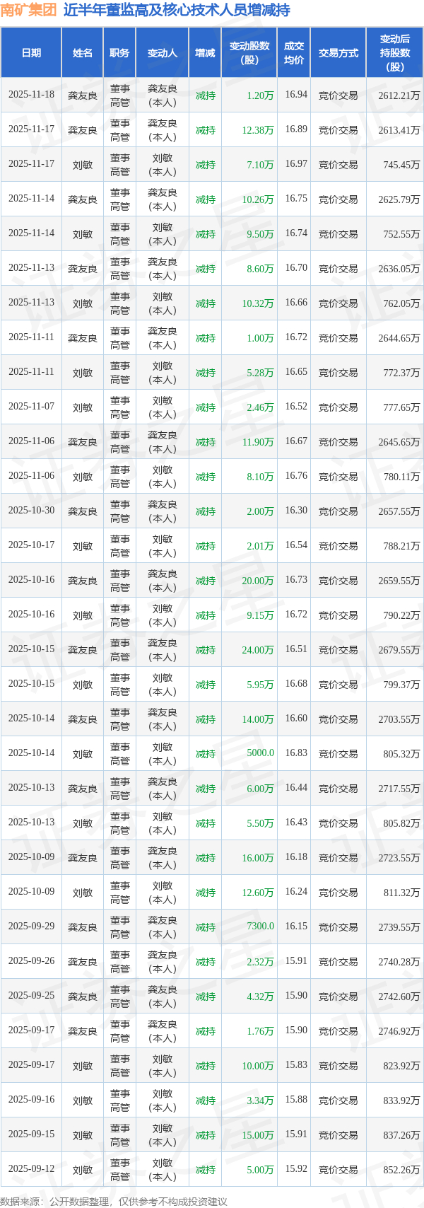 南矿集团近半年内的董监高及核心技术人员增减持详情如下: