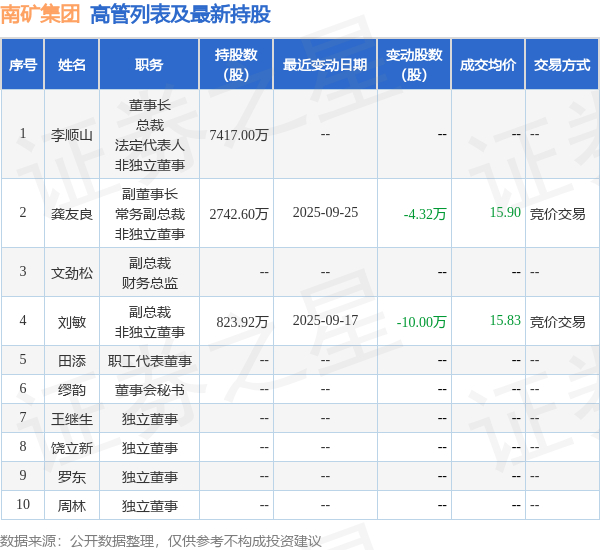 证券之星消息,根据11月21日市场公开信息、上市公司公告及交易所披露数据整理,南矿集团(001360)最新董监高及相关人员股份变动情况:2025年11月20日公司董事,高管龚友良共减持公司股份1400.0股,占公司总股本为0.0007%。变动期间公司股价上涨0.67%,11月20日当日收盘报16.53元。