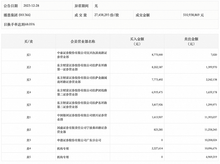 具体来看,机构买入222.76万元,卖出1706.59万元,合计净卖出1483.83万元。此外,知名游资现身龙虎榜,赵老哥(中国银河证券绍兴证券营业部)、宁波桑田路(国盛证券宁波桑田路证券营业部)分别卖出1139.30万元、1125.82万元;中泰证券宜兴氿滨南路证券营业部、东方财富证券拉萨东环路第一证券营业部分别买入877.50万元、820.26万元。