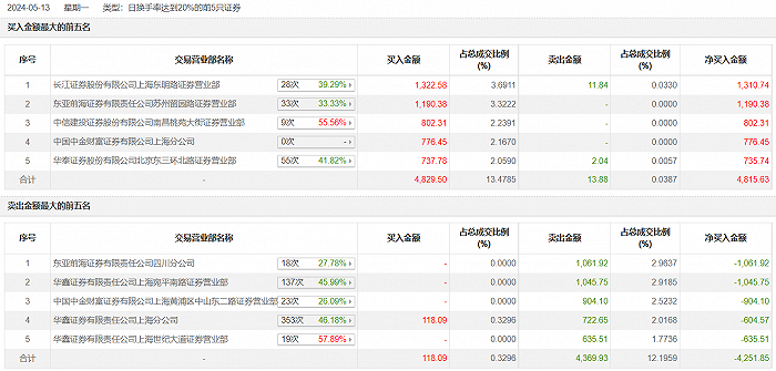 播恩集团5月13日涨停,龙虎榜数据显示,上榜营业部席位全天成交9331.4万元,占当日总成交金额比例为26.04%。其中,买入金额为4947.59万元,卖出金额为4383.81万元,合计净买入563.78万元。