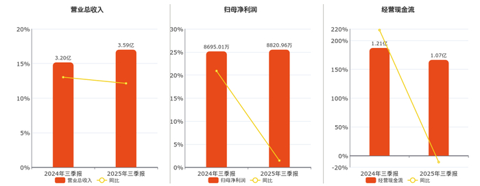 公司营业总收入为3.59亿元。归母净利润为8820.96万元。经营活动现金净流入为1.07亿元,较去年同报告期经营活动现金净流入减少1336.56万元,同比较去年同期下降11.09%。