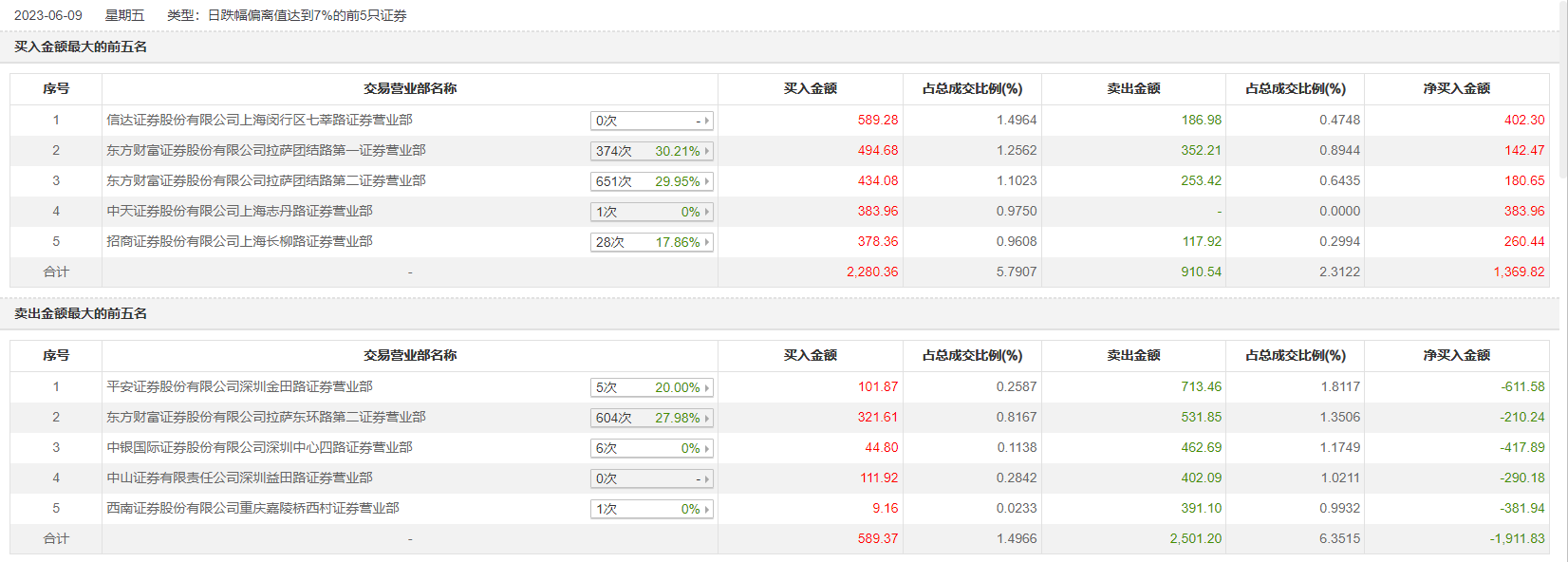具体来看,平安证券深圳金田路证券营业部、东方财富证券拉萨东环路第二证券营业部分别卖出713.46万元、531.85万元;信达证券上海闵行区七莘路证券营业部、东方财富证券拉萨团结路第一证券营业部分别买入589.28万元、494.68万元。