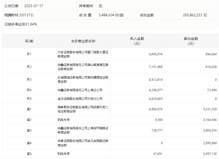 7月17日,翔腾新材今日涨停,龙虎榜数据显示,上榜营业部席位全天成交5552.84万元,占当日总成交金额比例为20.89%。其中,买入金额为3877.23万元,卖出金额为1675.61万元,合计净买入2201.62万元。