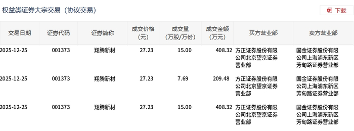 12月25日,翔腾新材大宗交易成交37.69万股,成交额1026.12万元,占当日总成交额的9.36%,成交价27.23元,较市场收盘价31.14元折价12.56%。
