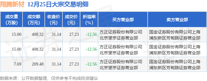 12月25日翔腾新材现3笔折价12.56%的大宗交易 合计成交1026.12万元