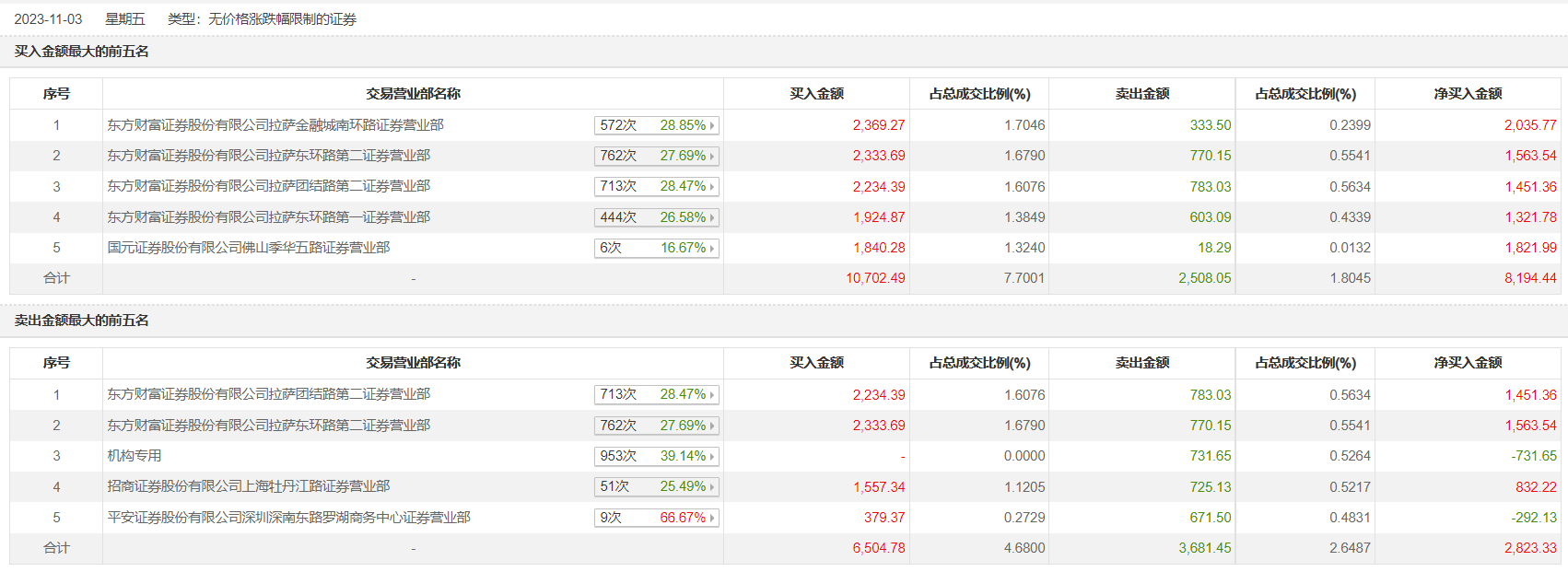 百通能源11月3日涨753.07%,全天换手率达84.29%,振幅达491.01%。龙虎榜数据显示,营业部席位合计净买入8002.87万元。其中,机构合计净卖出731.65万元。此外,东方财富证券拉萨金融城南环路证券营业部、东方财富证券拉萨东环路第二证券营业部分别买入2369.27万元、2333.69万元;东方财富证券拉萨团结路第二证券营业部、东方财富证券拉萨东环路第二证券营业部分别卖出783.03万元、770.15万元。