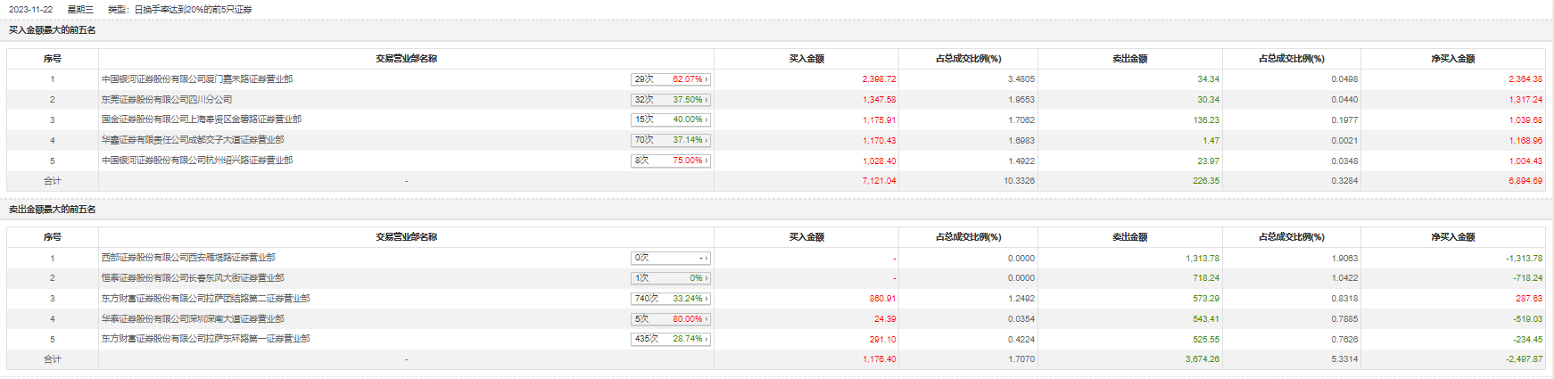 11月22日,百通能源今日涨停,全天换手率达50.41%,振幅达11.27%。龙虎榜数据显示,营业部席位合计净买入4396.83万元。其中,中国银河证券厦门嘉禾路证券营业部、东莞证券四川分公司分别买入2398.72万元、1347.58万元;西部证券西安雁塔路证券营业部、恒泰证券长春东风大街证券营业部分别卖出1313.78万元、718.24万元。