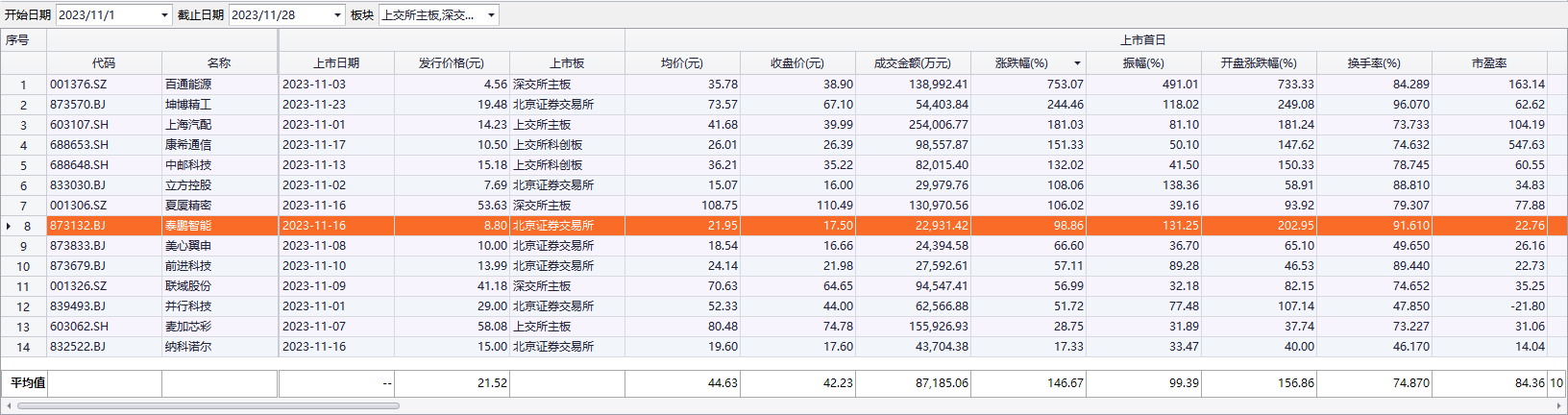 Choice数据显示,截止11月28日,11月共有14只新股上市发行。从上市首日表现来看,14只个股上市首日平均涨幅146.67%,其中