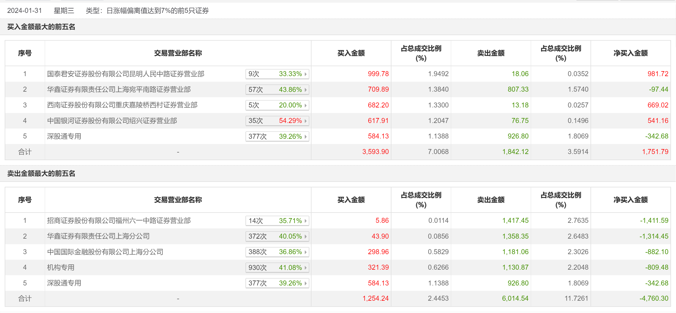 1月31日,百通能源今日涨停,龙虎榜数据显示,上榜营业部席位全天成交1.12亿元,占当日总成交金额比例为21.82%。其中,买入金额为4264.01万元,卖出金额为6929.86万元,合计净卖出2665.84万元。