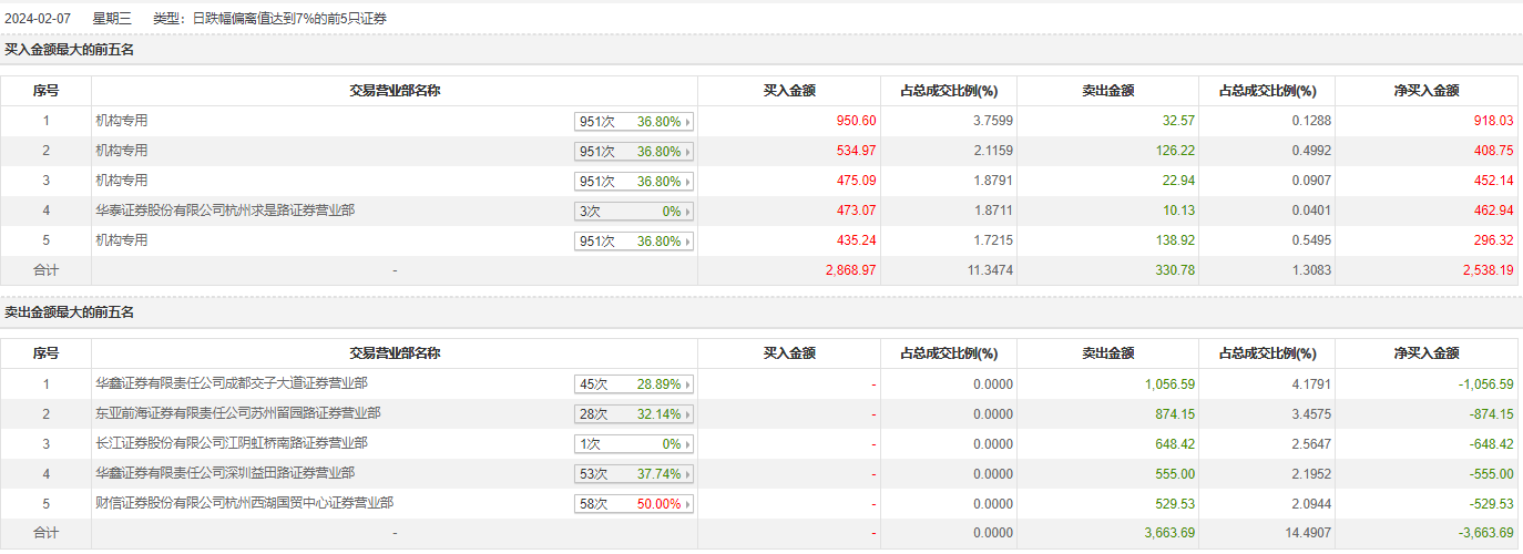百通能源2月7日跌停,全天换手率达34.72%,振幅达7.1%。龙虎榜数据显示,营业部席位合计净卖出1125.5万元。其中,机构买入2395.9万元,卖出320.66万元,合计净买入2075.25万元。此外,华鑫证券成都交子大道证券营业部、东亚前海证券苏州留园路证券营业部分别卖出1056.59万元、874.15万元;华泰证券杭州求是路证券营业部分别买入473.07万元。